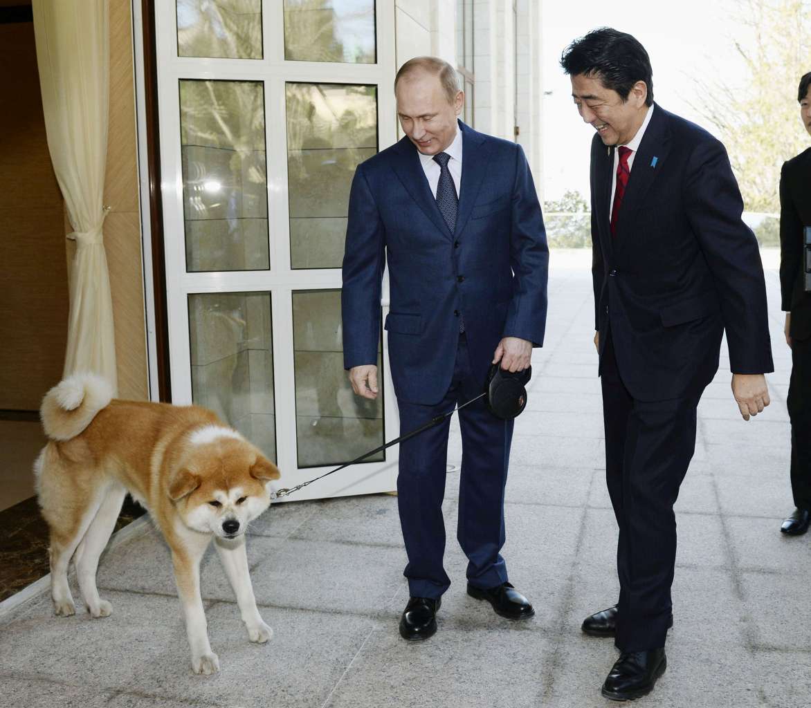 Russian President Vladimir Putin and his dog Yume, a gift from Japan in 2012, greet Japanese Prime Minister Shinzo Abe in Sochi, Russia, on Feb 8, 2014.