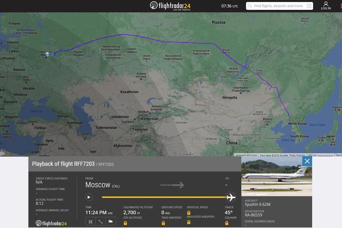 Tracking data from FlightRadar24 shows the Russian Air Force Ilyushin IL-62M flying direct from Moscow to Pyongyang on July 31 and returning on Aug 2.