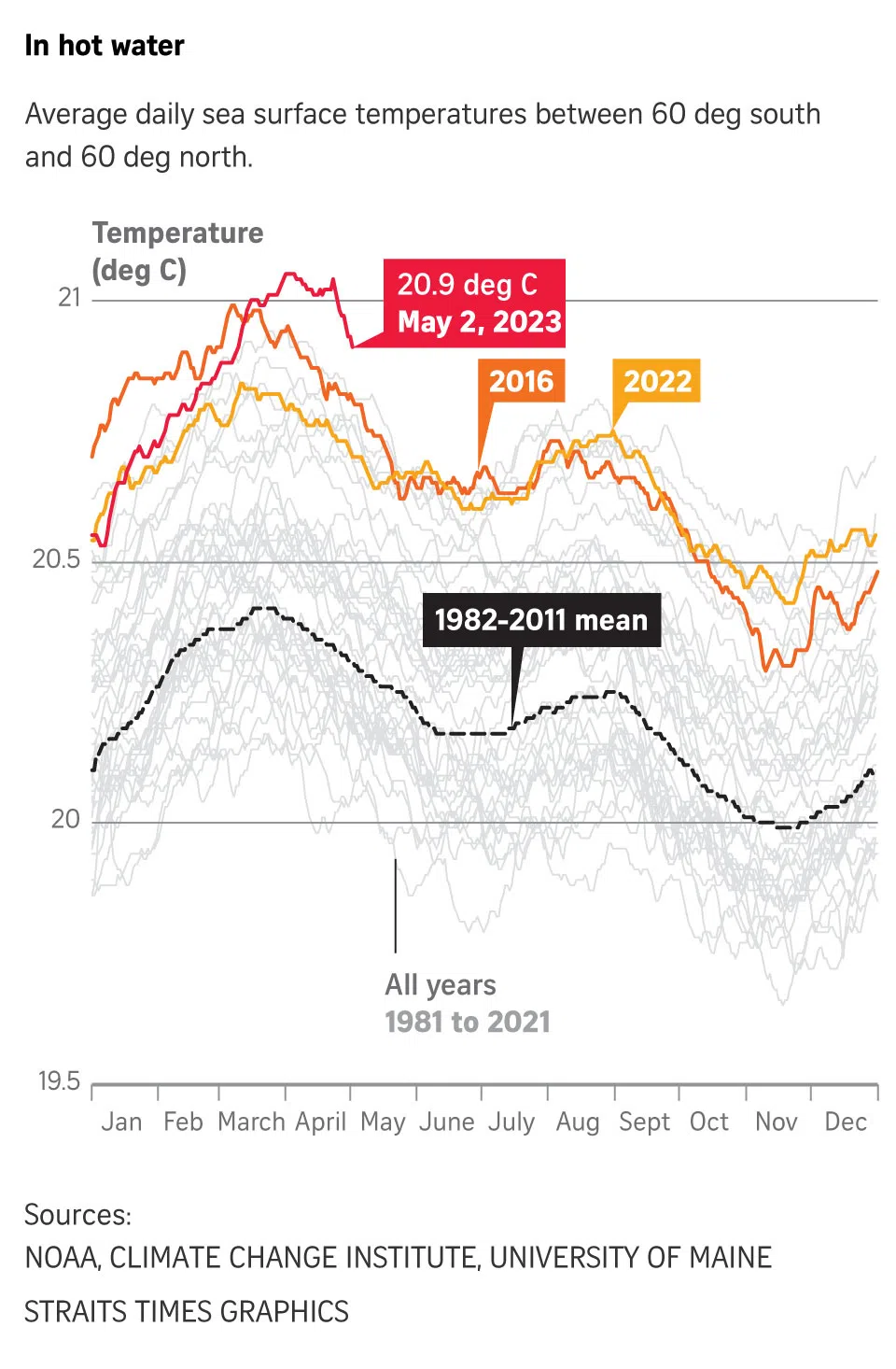 SINGAPORE - Ocean surface temperatures hit a record in April and remain at near-record levels, worrying some scientists who fear even warmer temperatures later in 2023 during a predicted switch to an El Nino event in the Pacific Ocean.