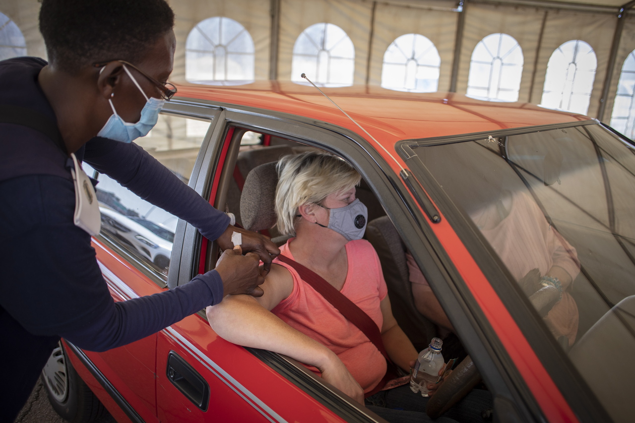 A person has her vaccine administered at a drive through Covid-19 coronavirus vaccination site in Pretoria, South Africa, on Aug 18, 2021.