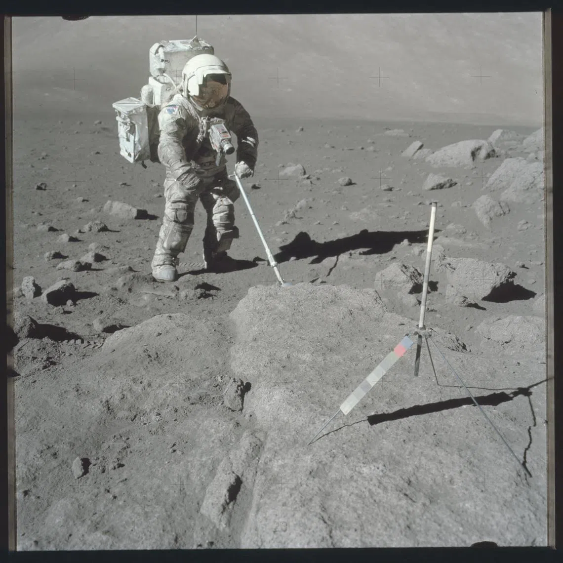 US astronaut Harrison Schmitt uses an adjustable sampling scoop to retrieve lunar samples during the second Apollo 17 extravehicular activity on Dec 12, 1972.