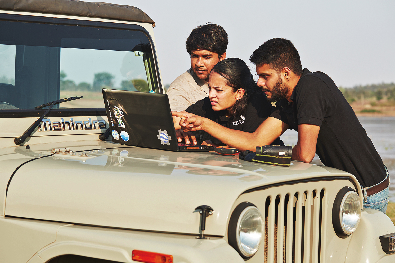 Conservationist Krithi Karanth (centre) checks data regarding animal sightings with her colleagues from the Centre for Wildlife Studies.