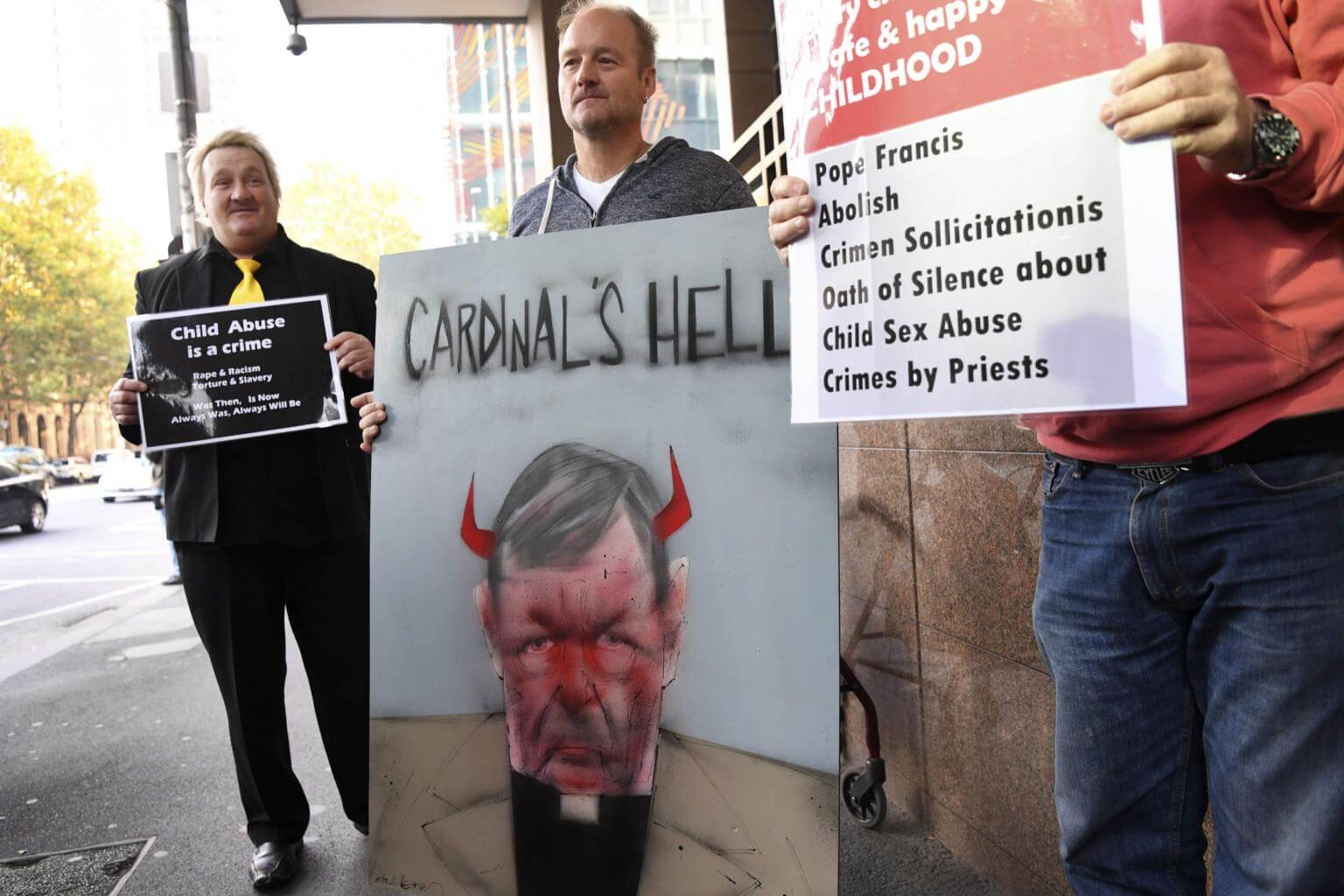 Protesters hold up placards as Vatican finance chief Cardinal George Pell arrives in court in Melbourne, on May 1, 2018.
