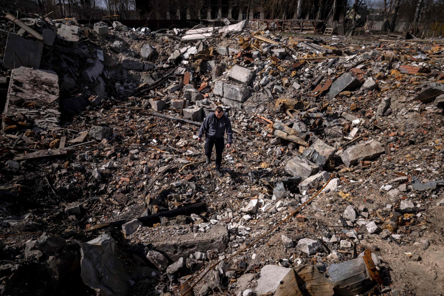 A policeman walks among the rubble of destroyed houses in Bohdanivka village, north-east of Kyiv, on April 14, 2022.