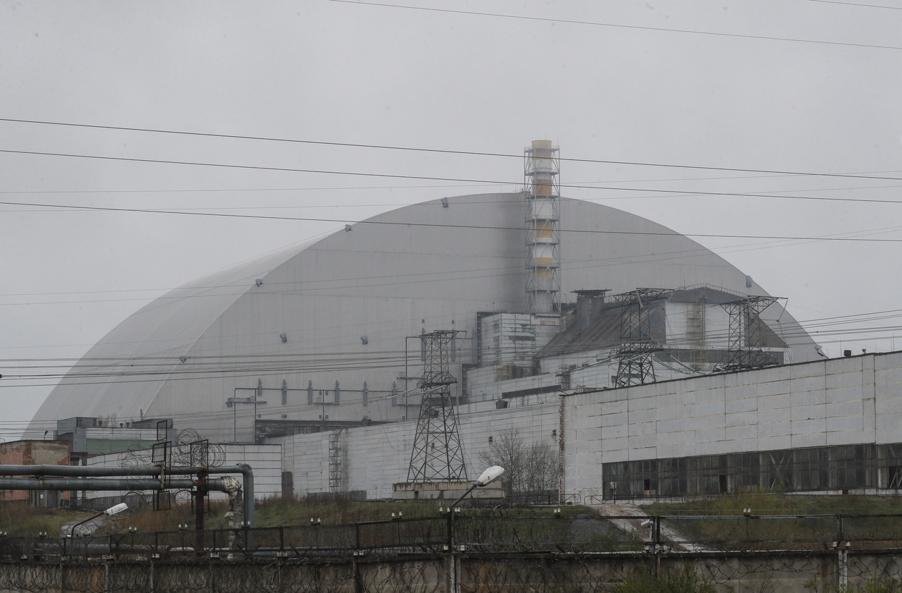 The protective shelter over the remains of the Chernobyl nuclear power plant in Ukraine on April 26, 2022.