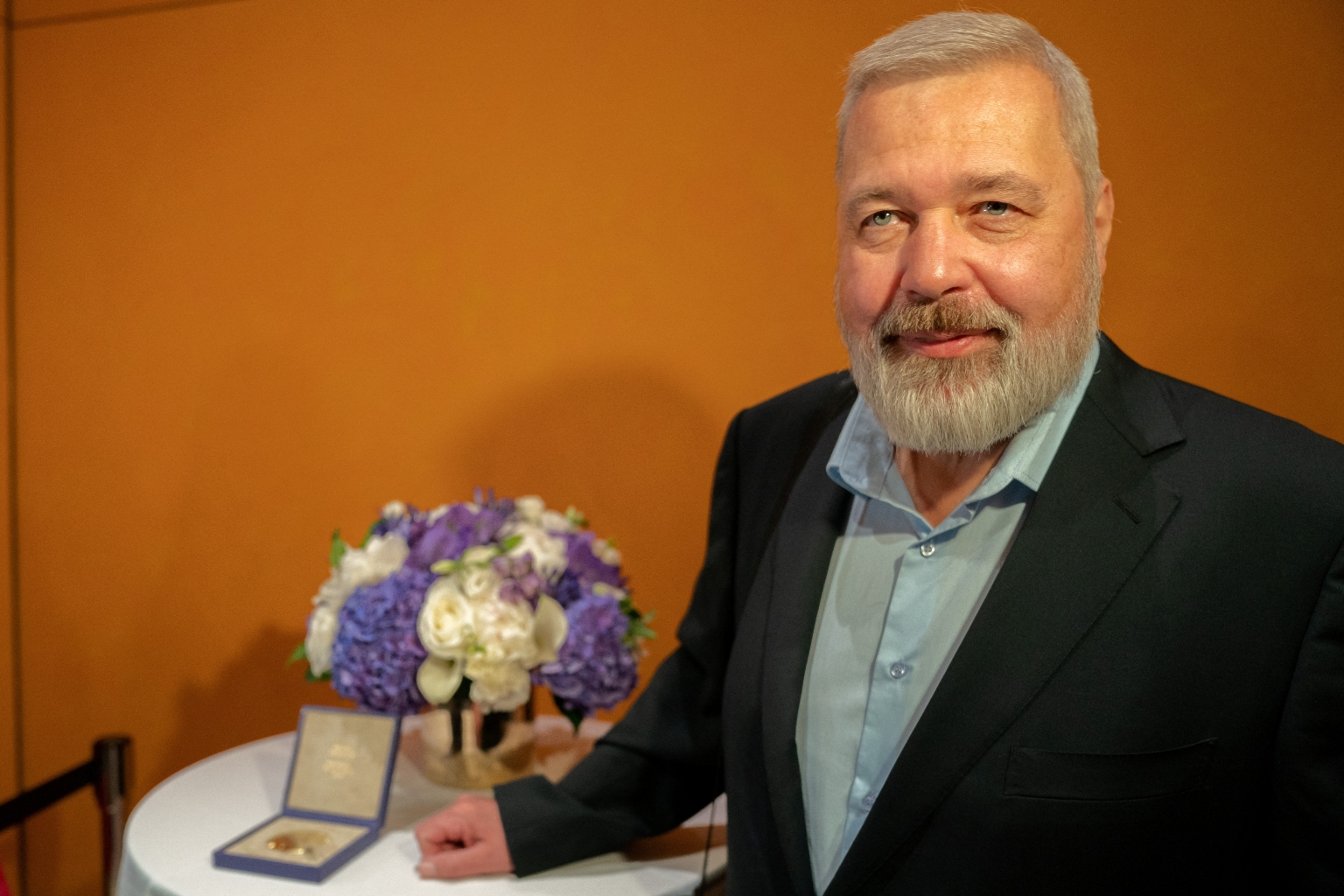 Dmitry Muratov with his 2021 Nobel Peace Prize medal prior to its auction by Heritage Auctions in New York City, on June 20, 2022.