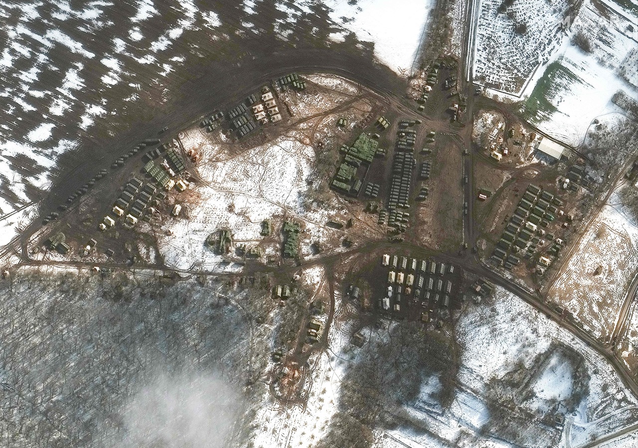 Troops in a rural area southwest of Russia's Belgorod region, which is near the border in Ukraine, in February.