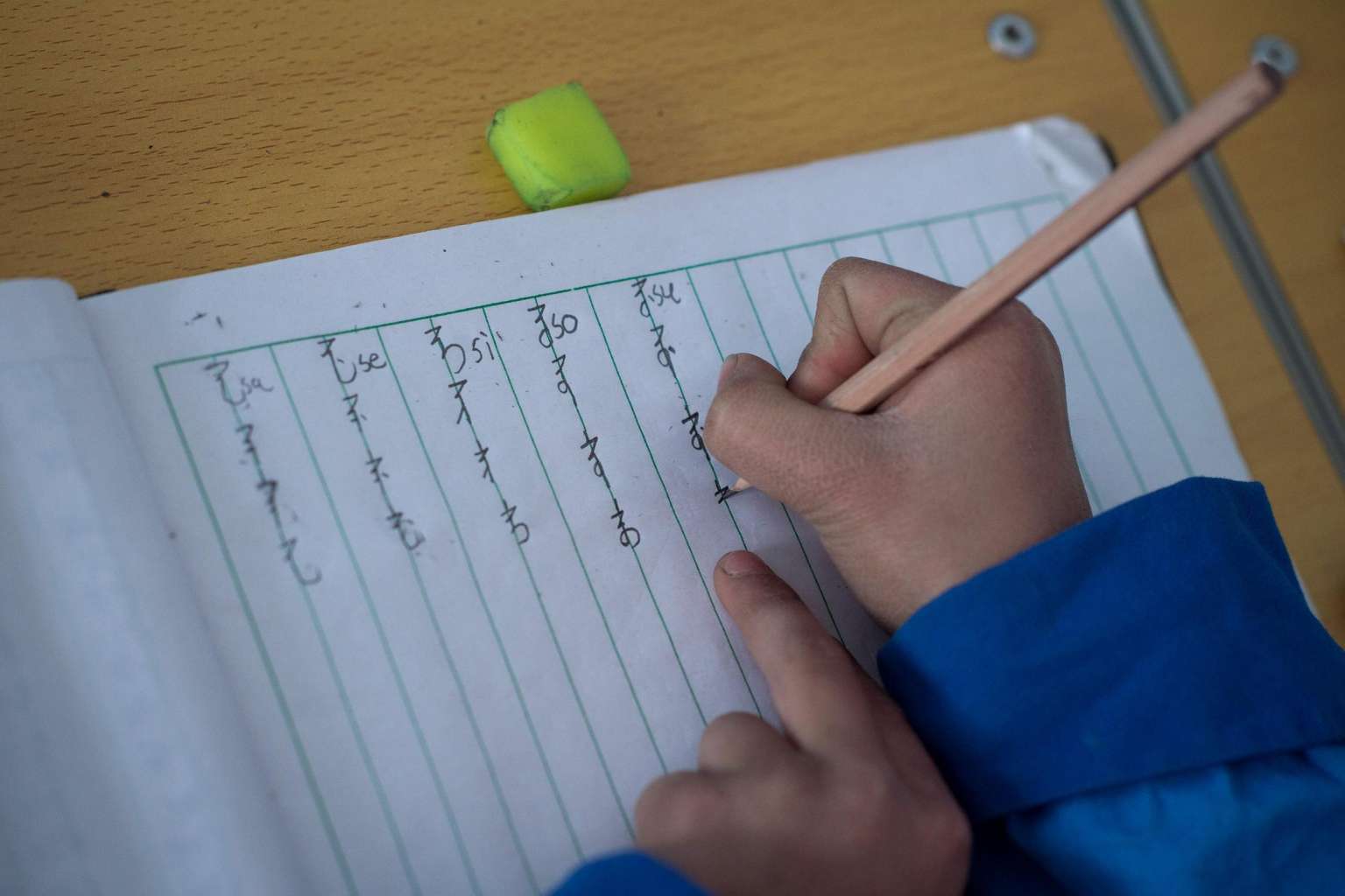 A student of the Sanjiazi Manchu school writting Manchu during a class in Sanjiazi village, Heilongjiang province.
