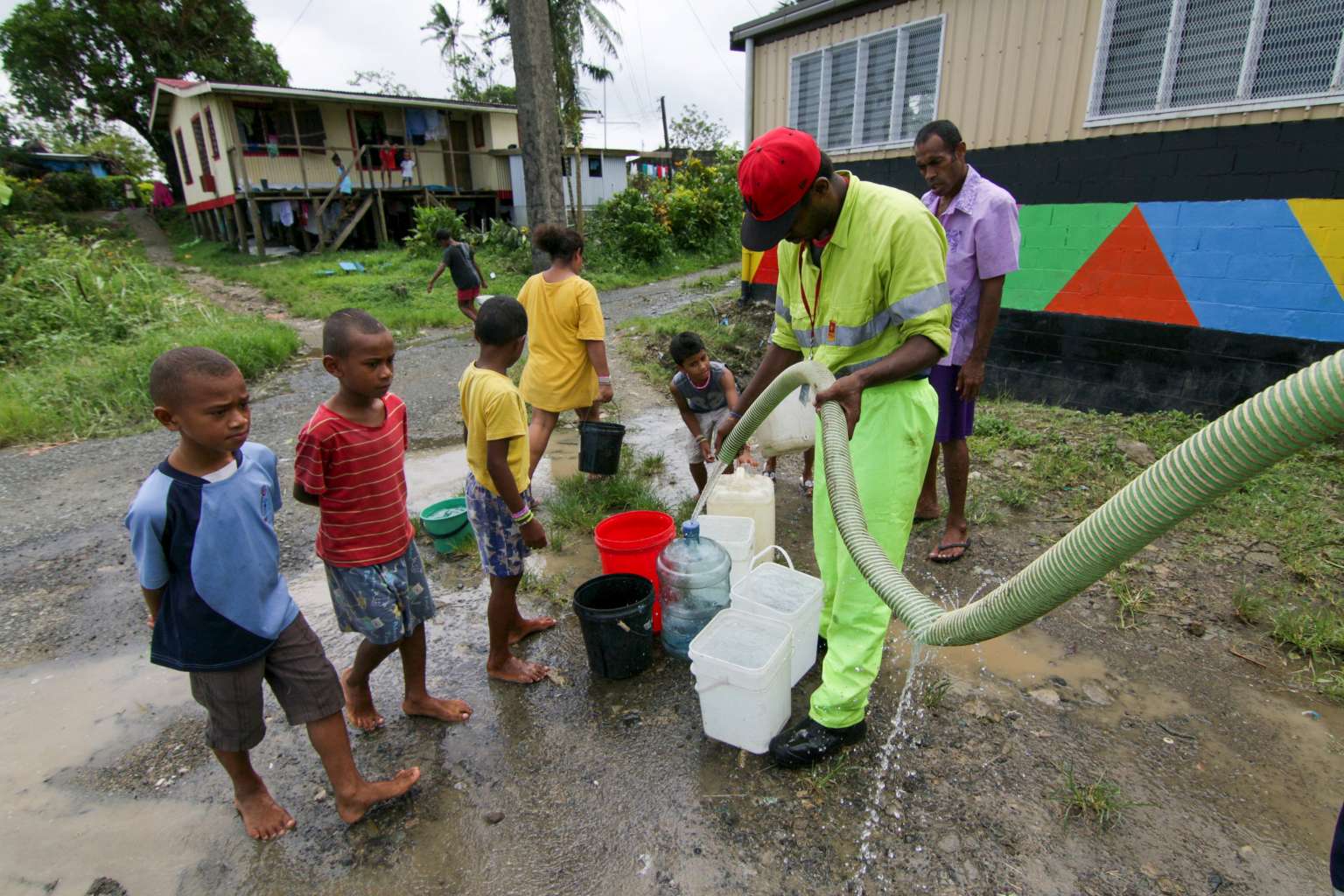 A worker from Suva's City Council fills residents' buckets with fresh water after power outages caused by Cyclone Winston stopped pumps from working.