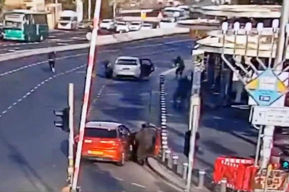 Security camera footage obtained by Reuters shows a white car stopping beside the crowded bus stop. Two men then step out, guns drawn, and charge at the crowd as people scatter. Shortly afterwards the Palestinian attackers are themselves shot.