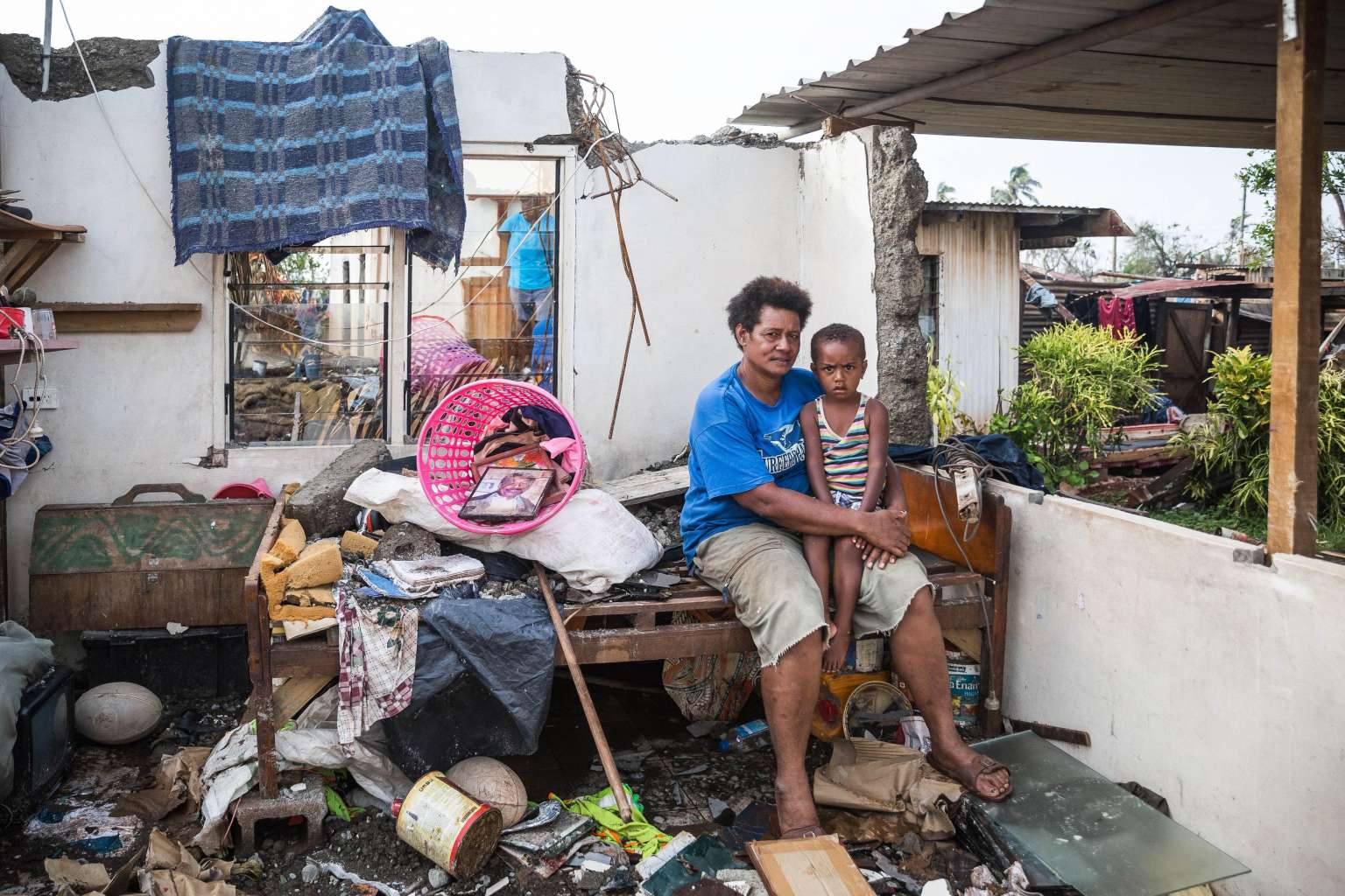 A woman holding her son in the remnants of her house after Cyclone Winston devastated Fiji.