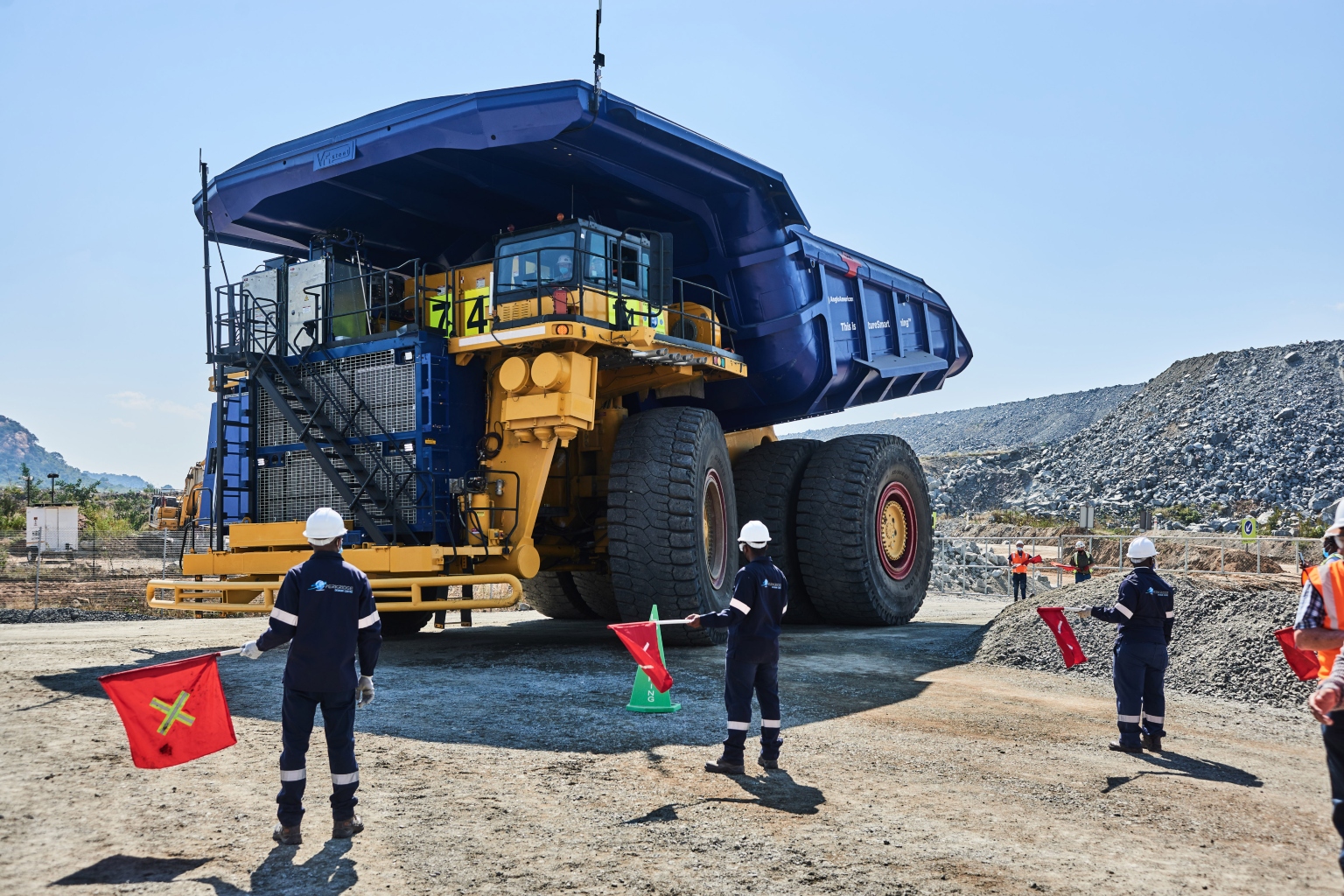 Workers guiding a hydrogen-powered truck during a demonstration at a platinum mine in Mogalakwena, South Africa.