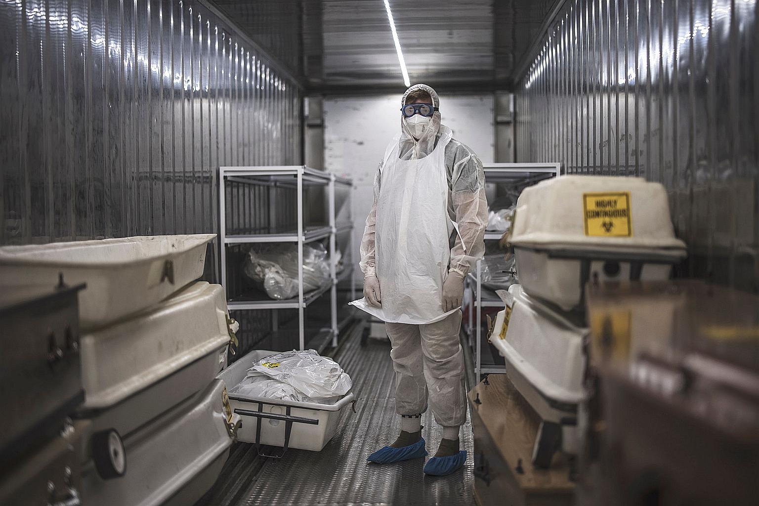 JOHANNESBURG (AFP) - The cold hits you first. Then comes the smell. Inside a refrigerated shipping container are 17 plastic-wrapped corpses, each bearing a yellow label reading "highly contagious".