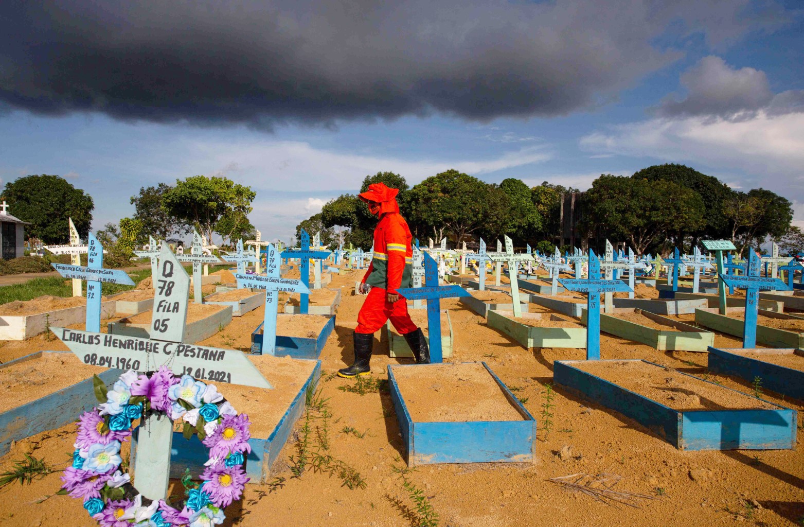 A gravedigger among graves of Covid-19 victims at the Nossa Senhora Aparecida cemetery in Manaus, in Brazil's Amazonas state, earlier this week. Brazil has gone from 300,000 deaths to 400,000 in about a month, less than the two it took to go from 200,000 to 300,000.