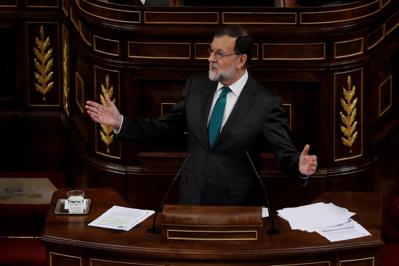Spain's Prime Minister Mariano Rajoy gestures during a motion of no confidence debate at Parliament in Madrid, Spain, on May 31, 2018.