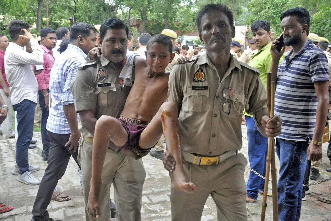 A boy, who was injured in a stampede at a religious gathering, brought to a hospital for a treatment in Hathras district in the northern state of Uttar Pradesh, India, on July 2, 2024.