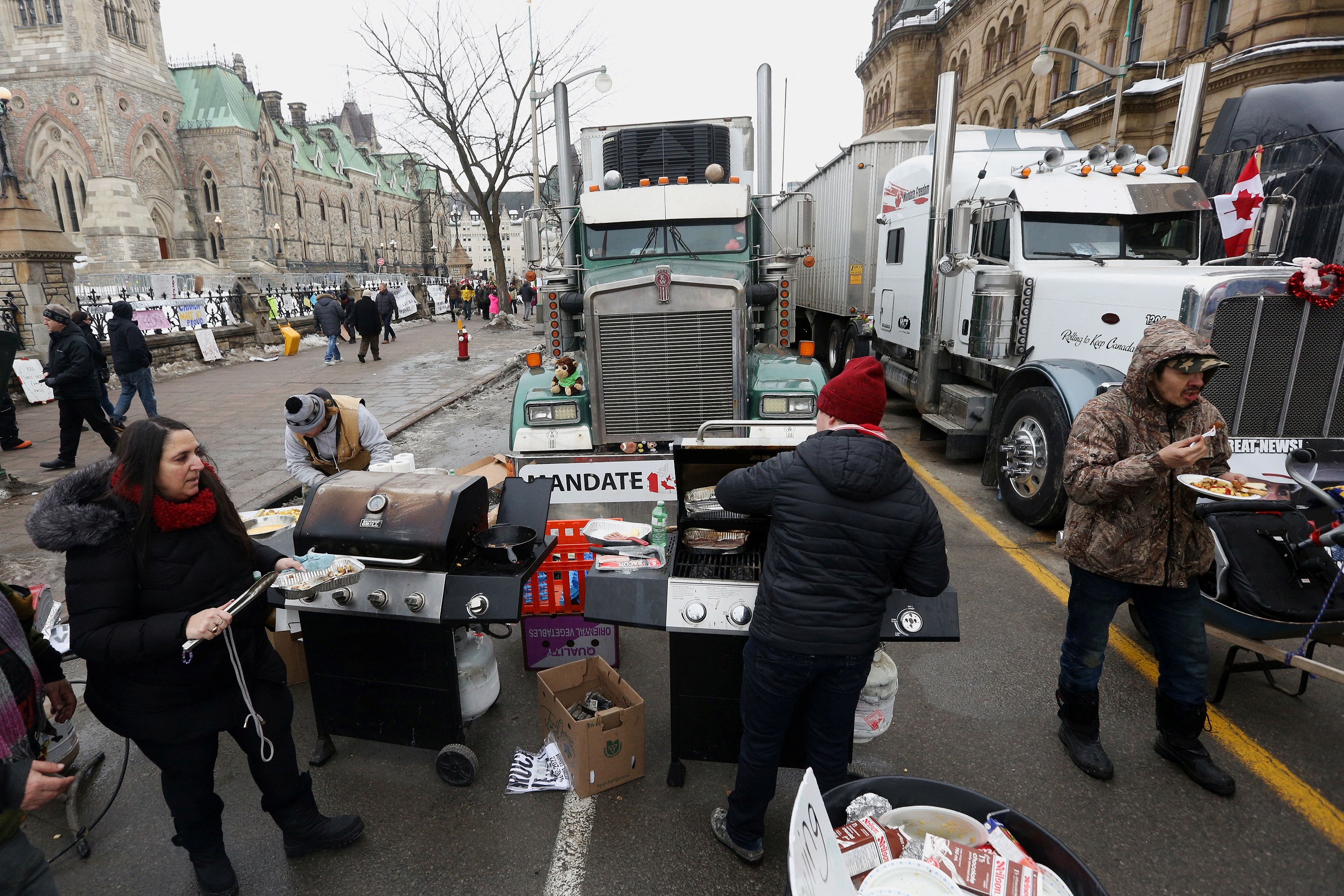 Protesters prepare food in front of Parliament Hill and parked trucks, in Ottawa, on Feb 11, 2022.