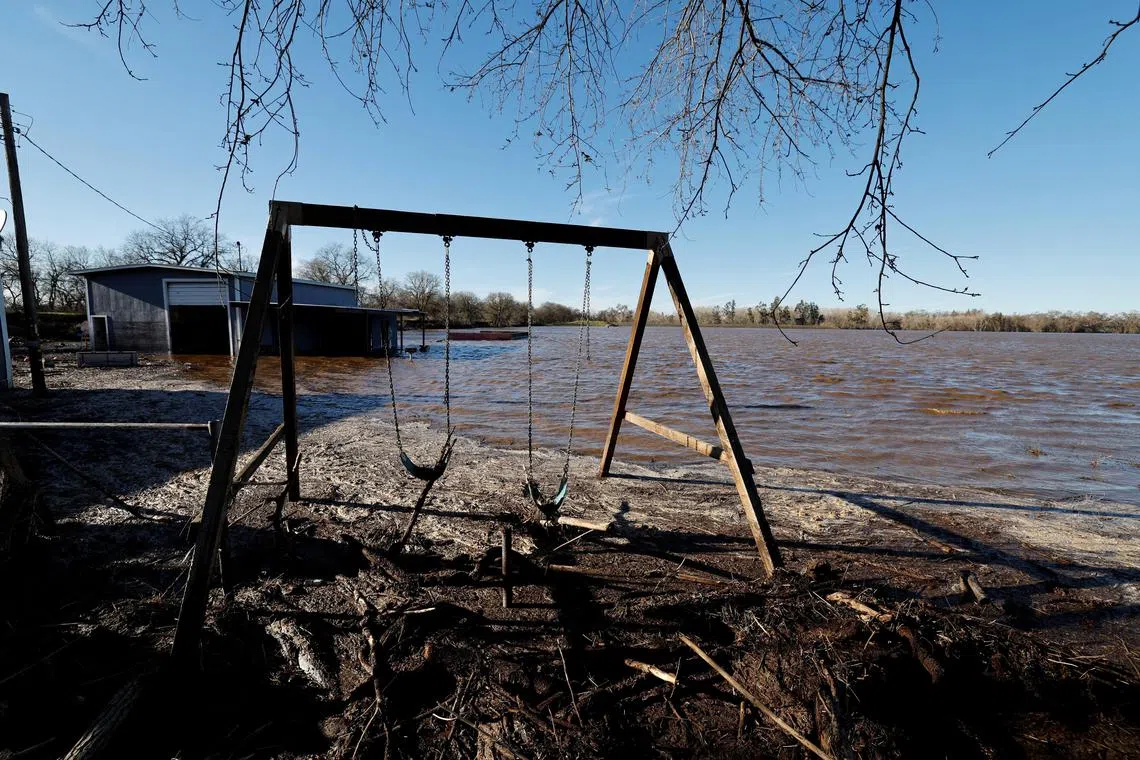A swing set is covered with debris after rainstorms caused a levee to break, flooding Sacramento County roads and properties near Wilton, California, US.