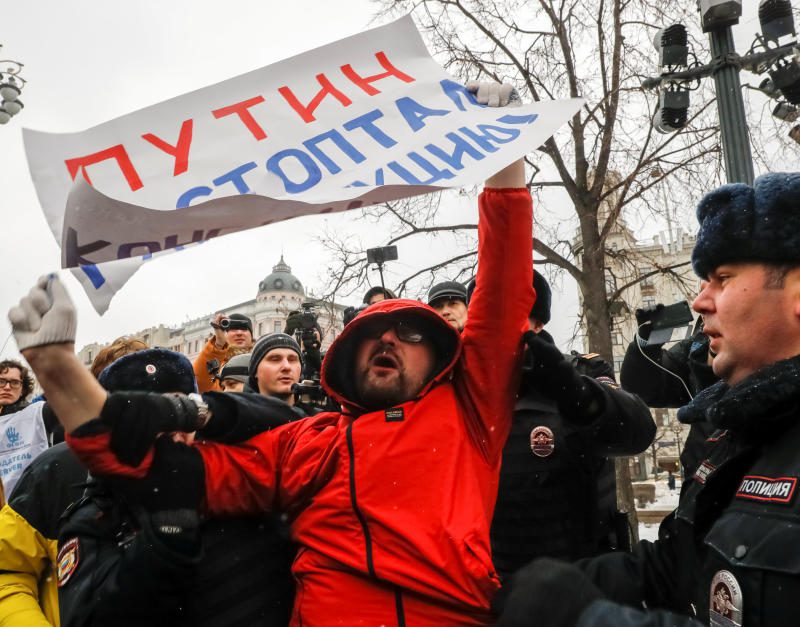 Police officers detain a protester during a rally to demand freedom for political prisoners in Moscow, Russia, on Feb 10, 2019.