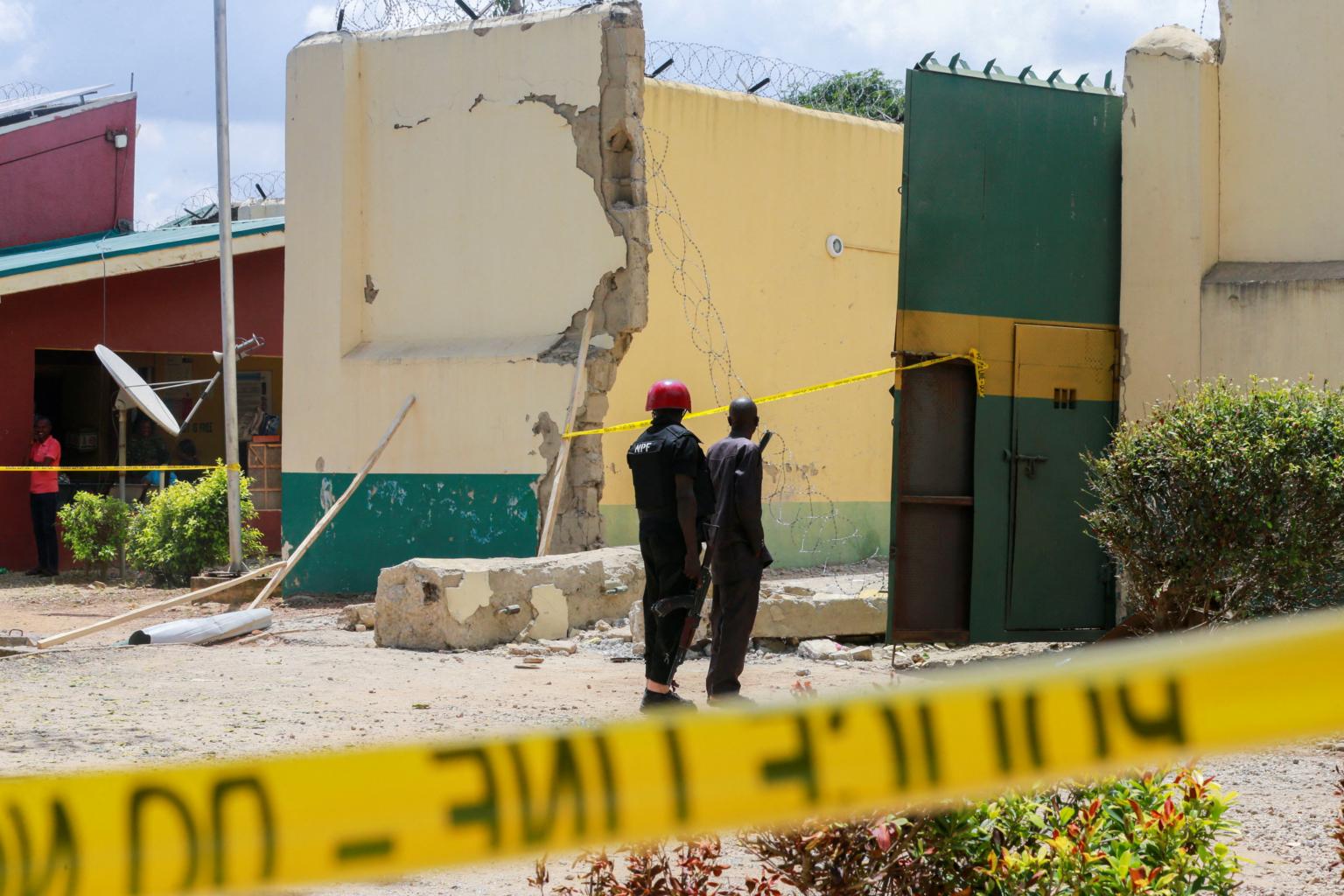 Prison officials stand near a gate destroyed with explosives during a prison break attack in Nigeria on July 6, 2022.