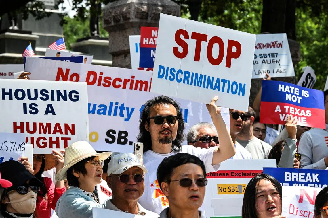 Protesters in front of the Texas State Capitol in Austin on May 10 rallying against a Bill that aims to ban citizens and entities from countries such as China from buying properties in Texas.