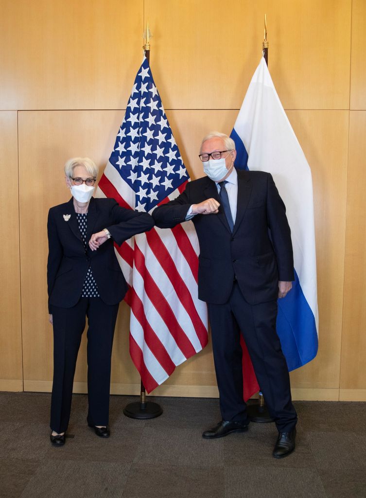 US Deputy Secretary of State Wendy Sherman and Russian Deputy Foreign Minister Sergei Ryabkov touched elbows and wore face masks as they opened the talks, according to photos by the US mission in Geneva.