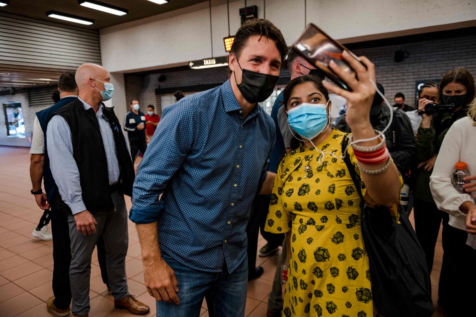 MONTREAL (AFP) - A beaming Justin Trudeau posed for selfies and bumped elbows with supporters in a Montreal subway station early on Tuesday (Sept 21), hours after the Canadian prime minister narrowly won a third term in a snap election.