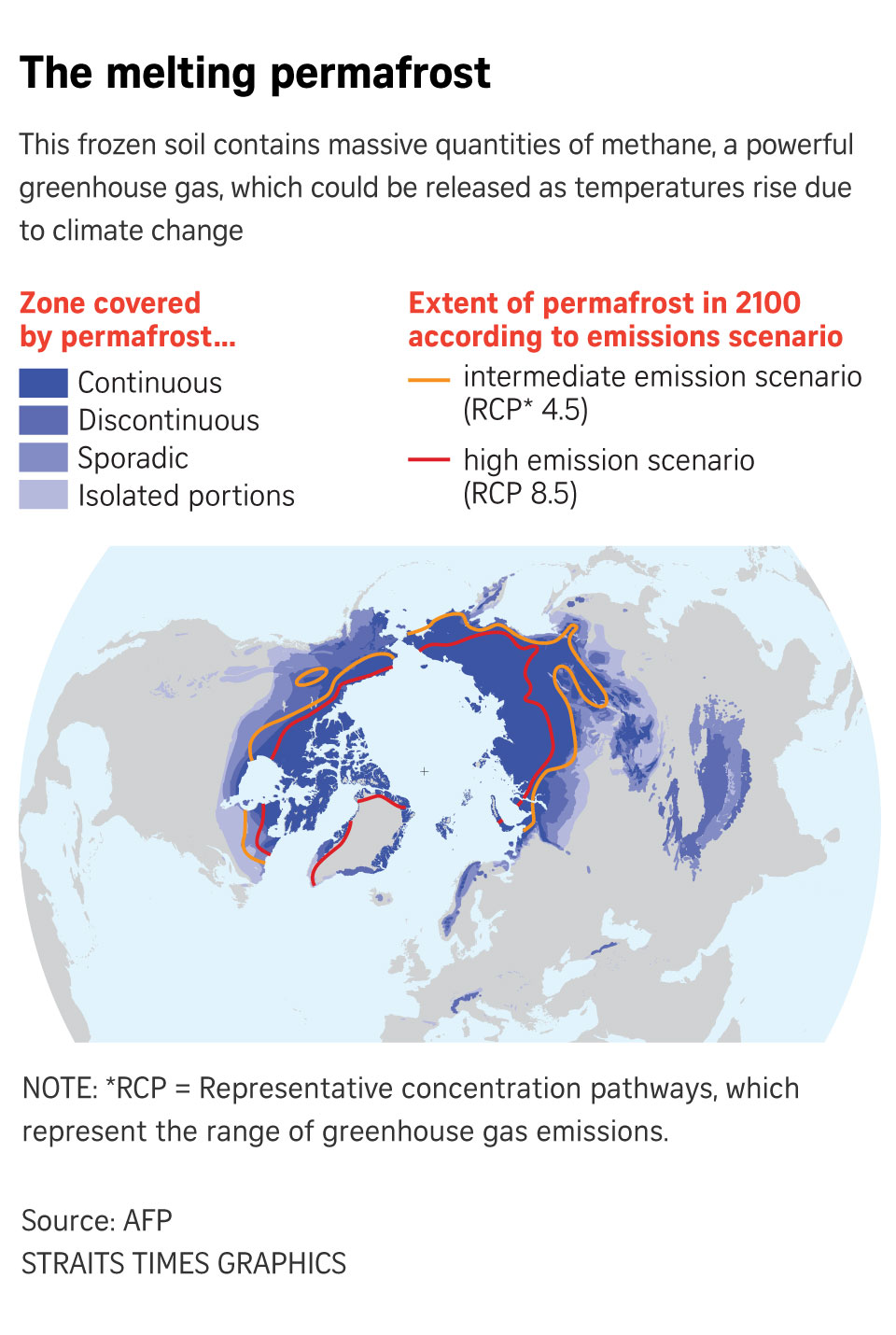 ABISKO, SWEDEN (AFP) - Sheltered by snow-spattered mountains, the Stordalen mire is a flat, marshy plateau, pockmarked with muddy puddles. A whiff of rotten eggs wafts through the fresh air.