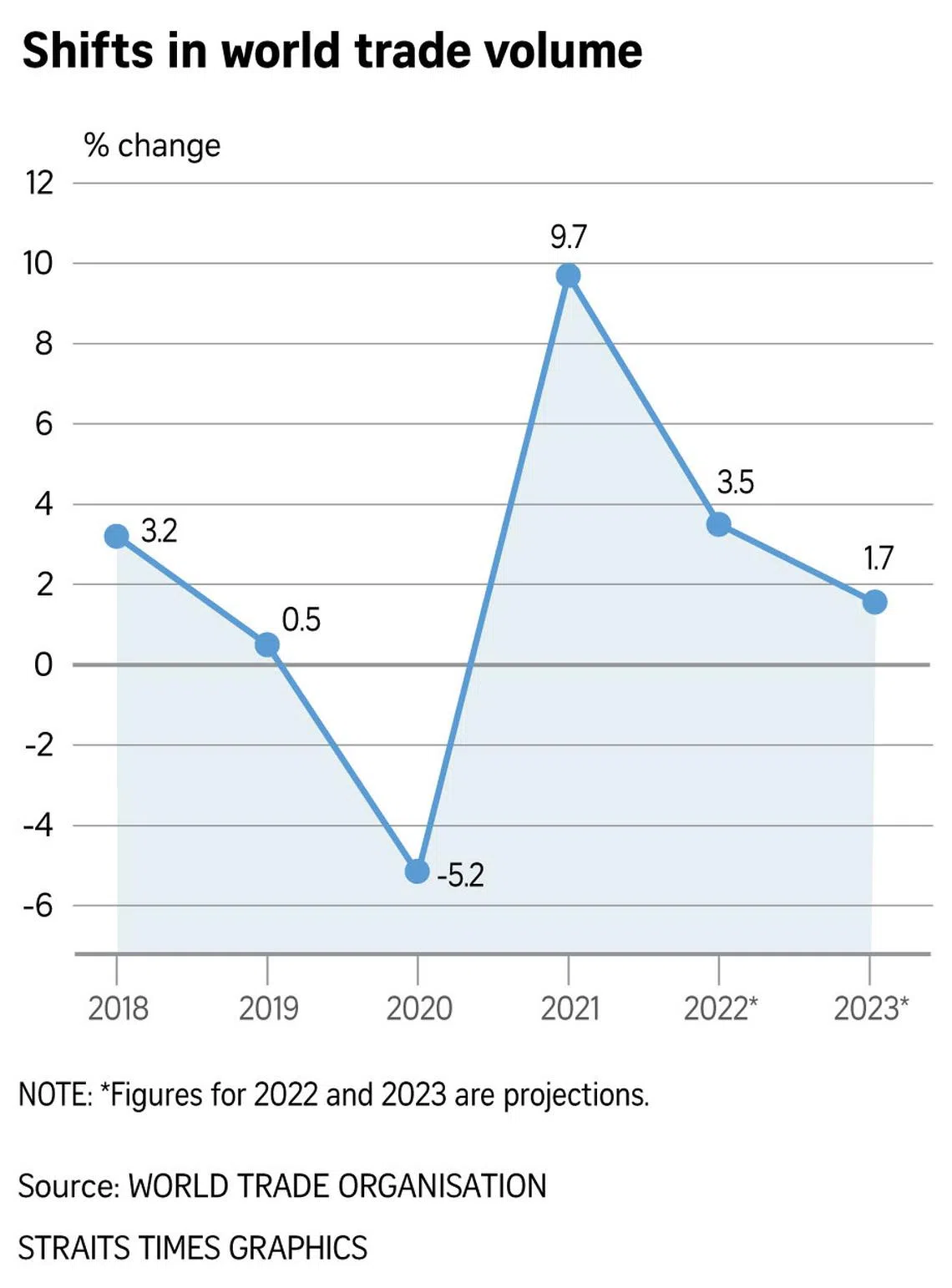 The growth of world trade – on which Asia’s economies are highly dependent – is slowing even faster than that of GDP. The World Trade Organisation (WTO) estimates that by volume, goods trade will rise by only 1.7 per cent in 2023, compared with an average of 2.6 per cent in the 12 years since it collapsed during the global financial crisis of 2008.