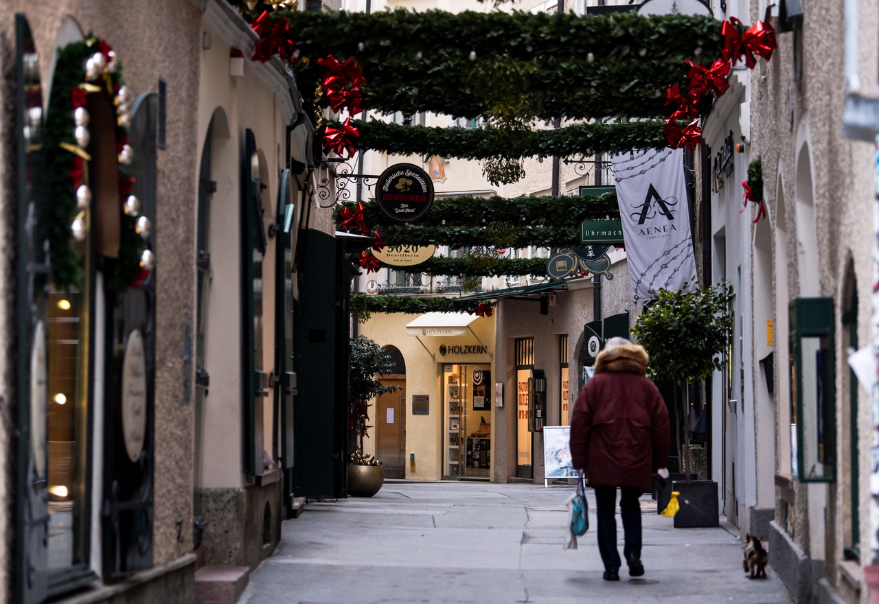 A pedestrian walks with his dog in Salzburg, Austria, on Nov 22, 2021.