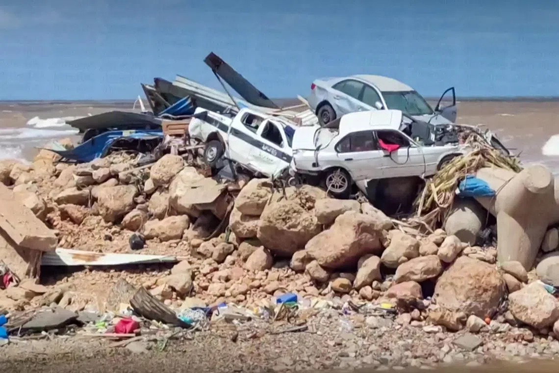 Piled-up vehicles in the wake of floods after the Mediterranean storm “Daniel” hit Libya’s eastern city of Derna.