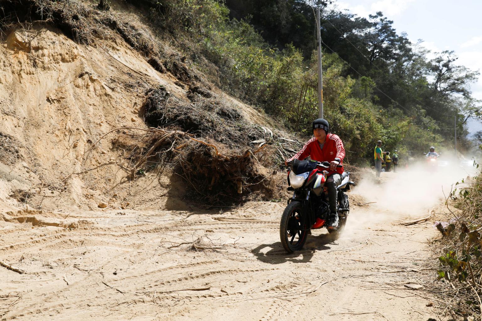 A man drives a motorcycle passing debris as a landslide and a fallen tree block a road in Guatemala on Feb 16, 2022.