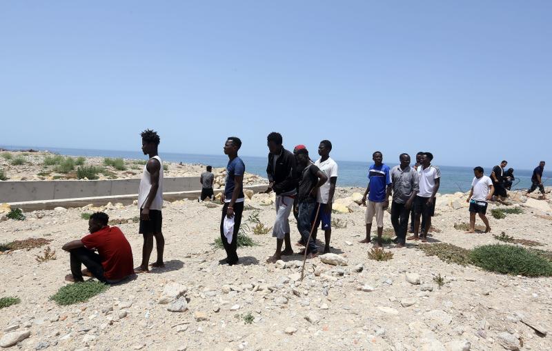 Migrants who survived the sinking of an inflatable dinghy boat off of the coast of Libya arrive on the shore of al-Hmidiya, east of the capital Tripoli on June 29, 2018.