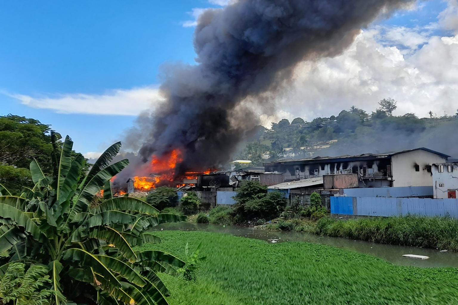 Flames rise from buildings in Honiara's Chinatown on Nov 26, 2021 as days of rioting have seen thousands ignore a government lockdown order.
