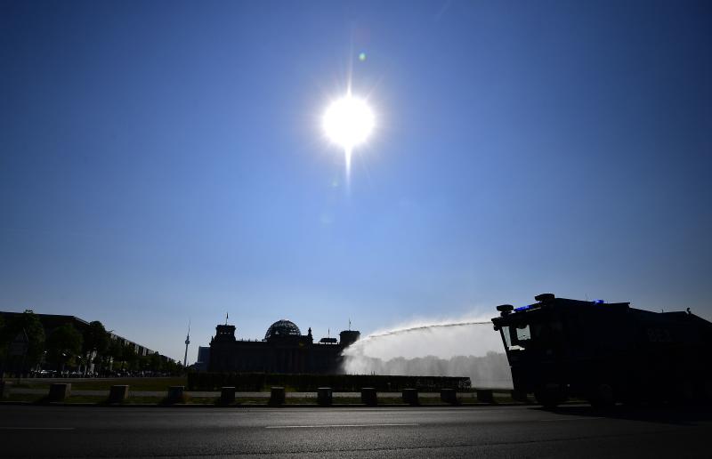 Berlin police use a water cannon to water the public gardens in front of the Reichstags building on July 27, 2018.