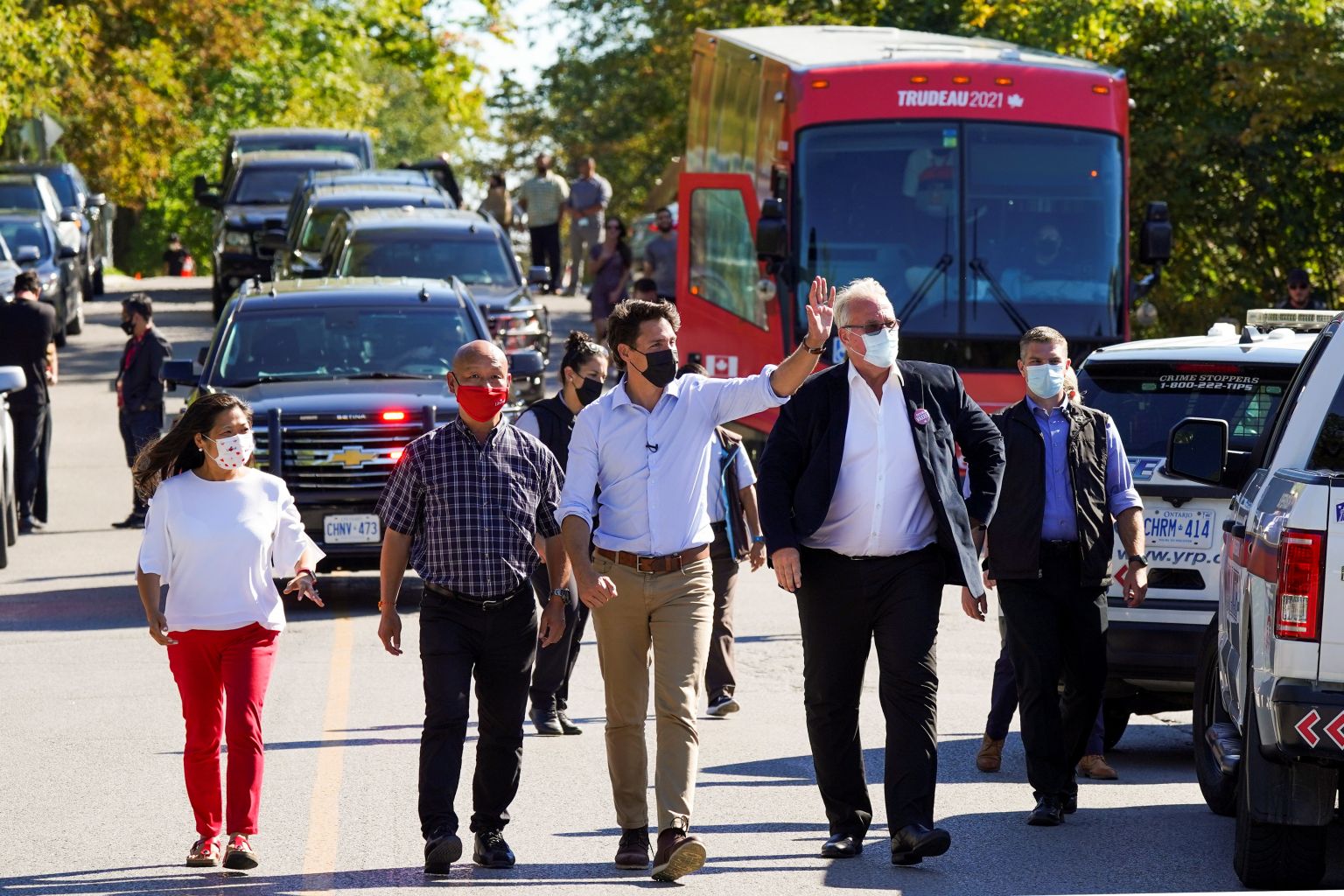 Canada's Liberal Prime Minister Justin Trudeau (centre) walks with local candidates during an election campaign stop in Markham, Ontario, on Sept 18, 2021.