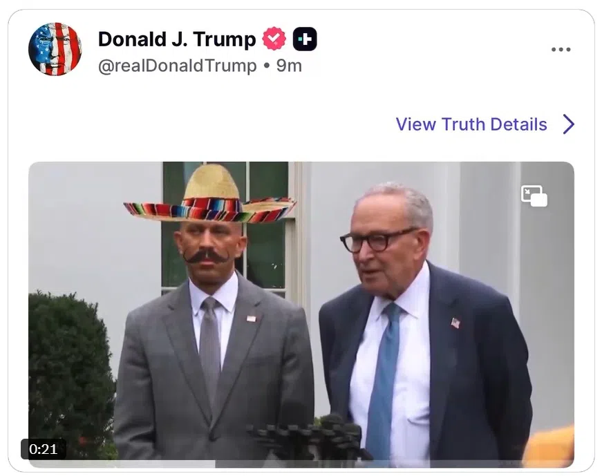 The video mocked Mr Schumer and Mr Jeffries in vulgar terms, falsely depicting them announcing plans to entice illegal immigrants with benefits, while showing Mr Jeffries wearing a sombrero and bushy moustache as mariachi music plays.