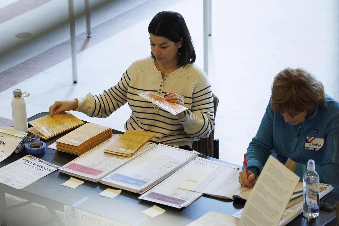 Poll workers sort through mail-in ballots while waiting on in-person voters, in Boston, Massachusetts.