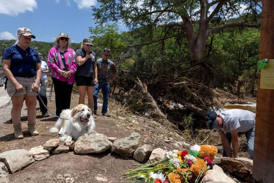 People stand next to a cross placed by the Guadalupe River, across from Camp Mystic, following deadly flooding, in Hunt, Texas, on July 10.