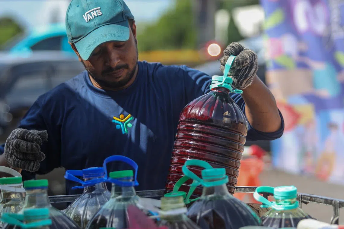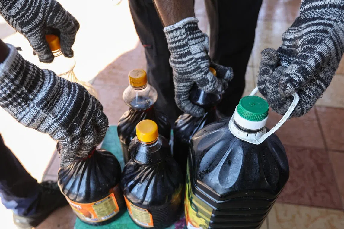 An Evergreen Oil and Feed staff member pulls out a bottle of used cooking oil collected from members of the public.