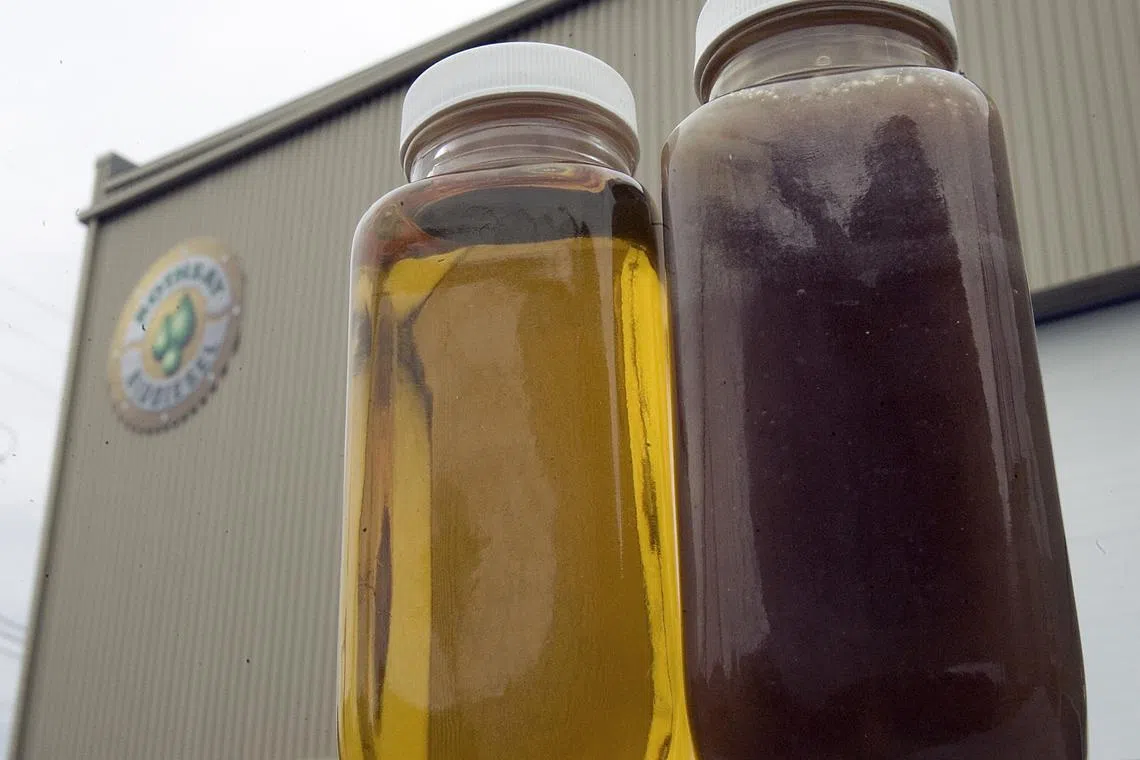 Two sample jars show used restaurant frying grease (right) and the refined end product of biodiesel.