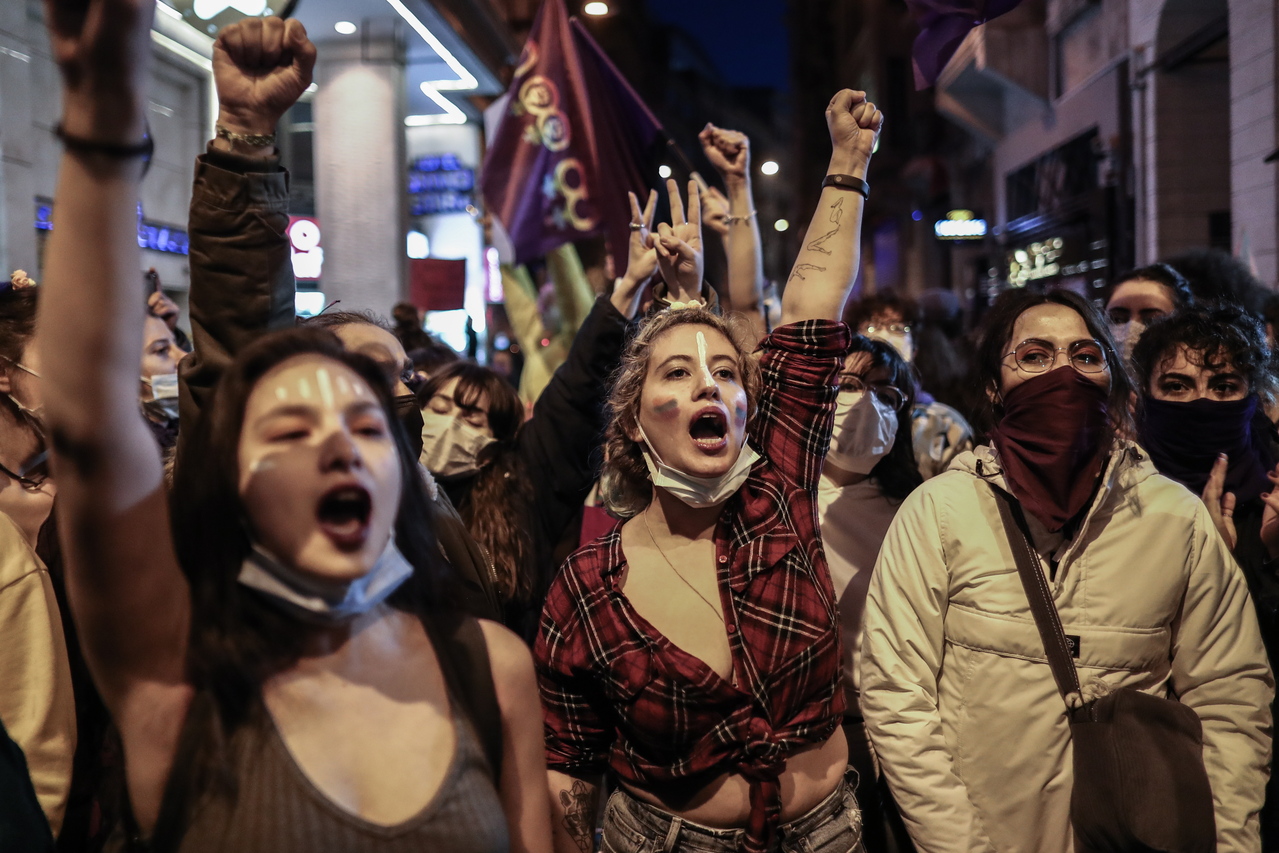 Women attend a rally marking the International Women's Day in Istanbul, on March 8, 2021.