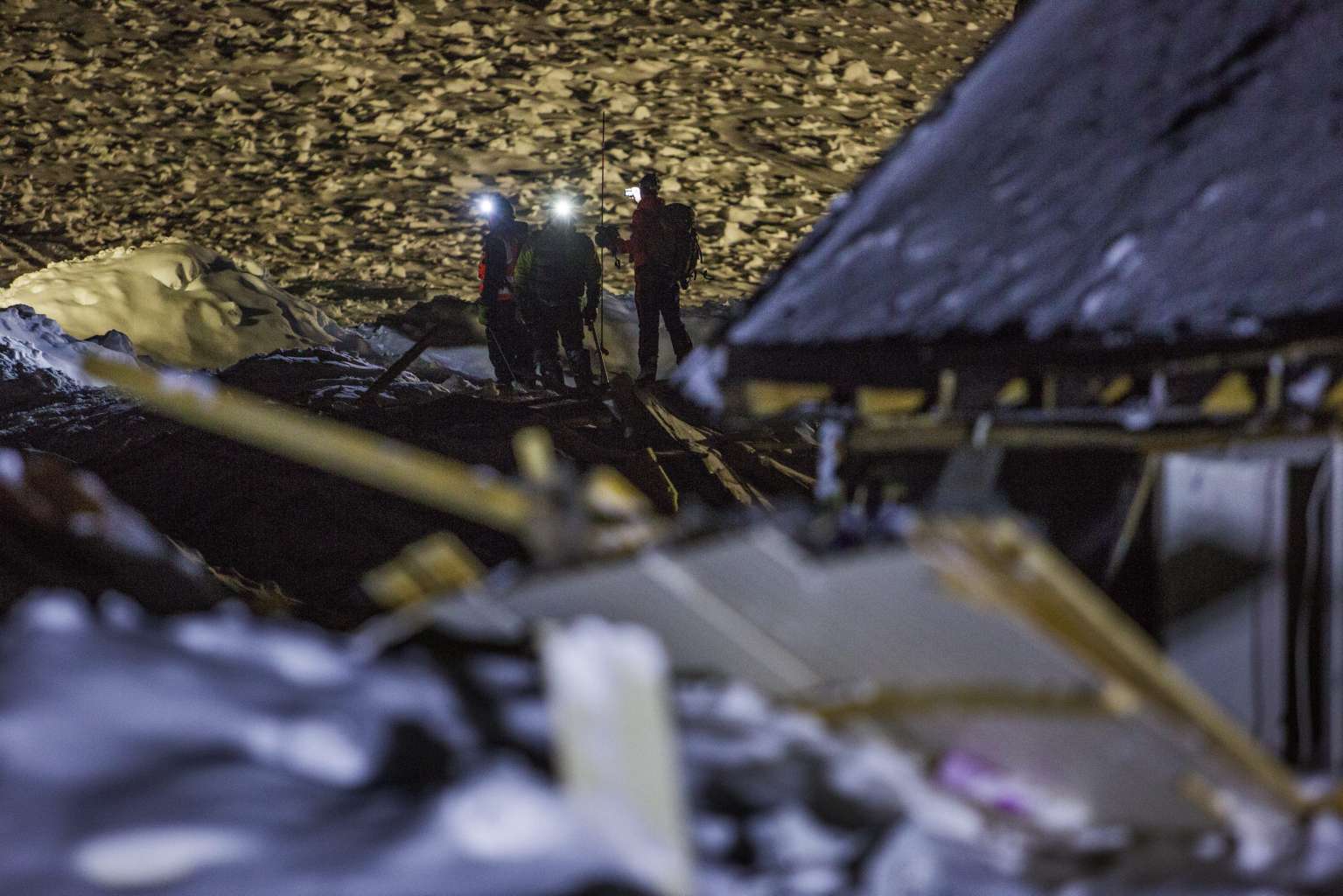 Avalanche experts from the Norwegian Geotechnical Institute inspects the avalanch area in Longyearbyen, Norway, on Dec 20, 2015.