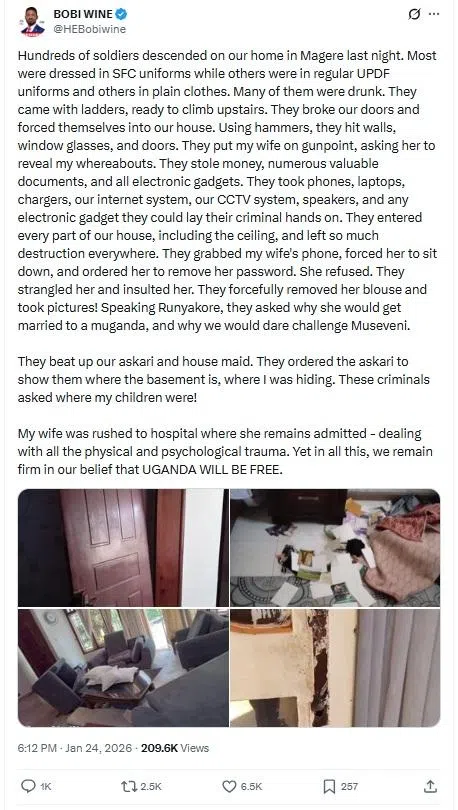 Overnight into Jan 24, soldiers forcefully entered the opposition leader’s home in the Magere suburb in Kampala’s north, breaking down doors and beating up staff, Mr Wine said in a post on X.
