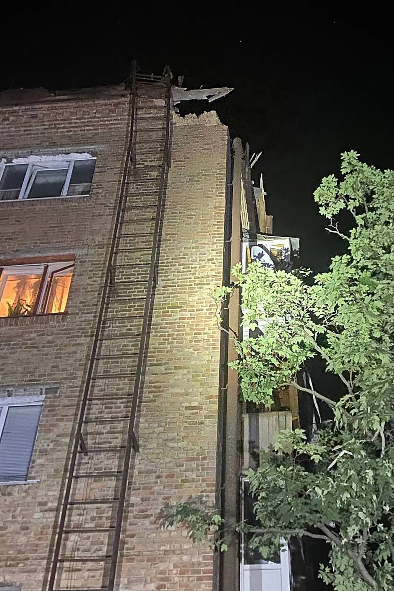 A building damaged as a result of falling debris after a massive drone attack overnight in Kyiv on May 28, 2023.