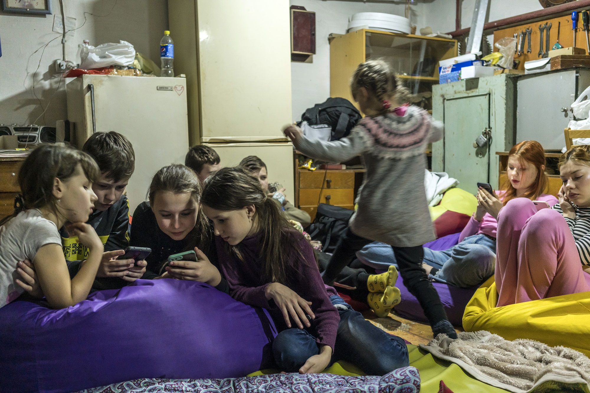 Children of schoolteachers who work at a Ukrainian school take shelter in the building's basement, on March 1, 2022.