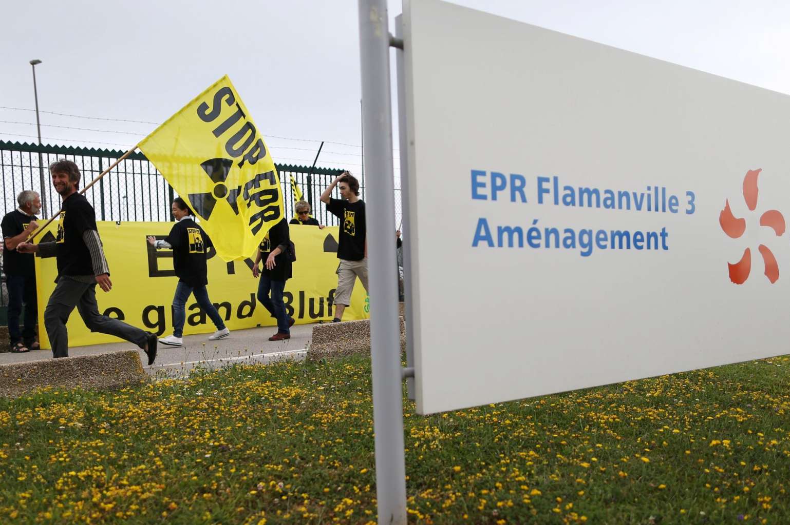 Greenpeace activists holding a banner as they walk near a EDF logo during a protest in front of the European Pressurised Reactor project (EPR) nuclear plant of Flamanville, north-western France, on June 28, 2017.