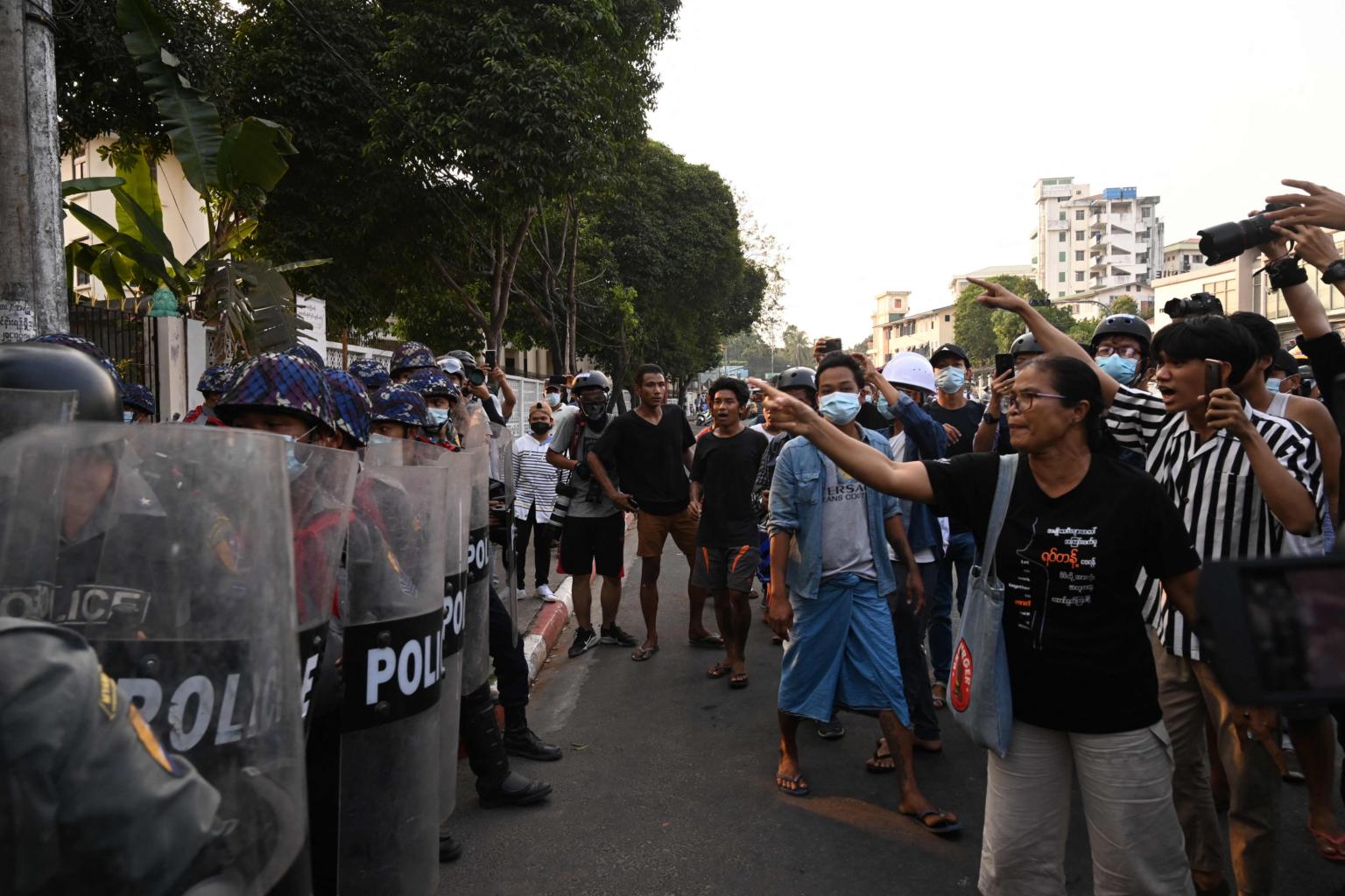 Residents shout as police stand guard at the entrance of a Buddhist monastery where pro-military supporters are taking shelter, in Yangon on Feb 18, 2021.