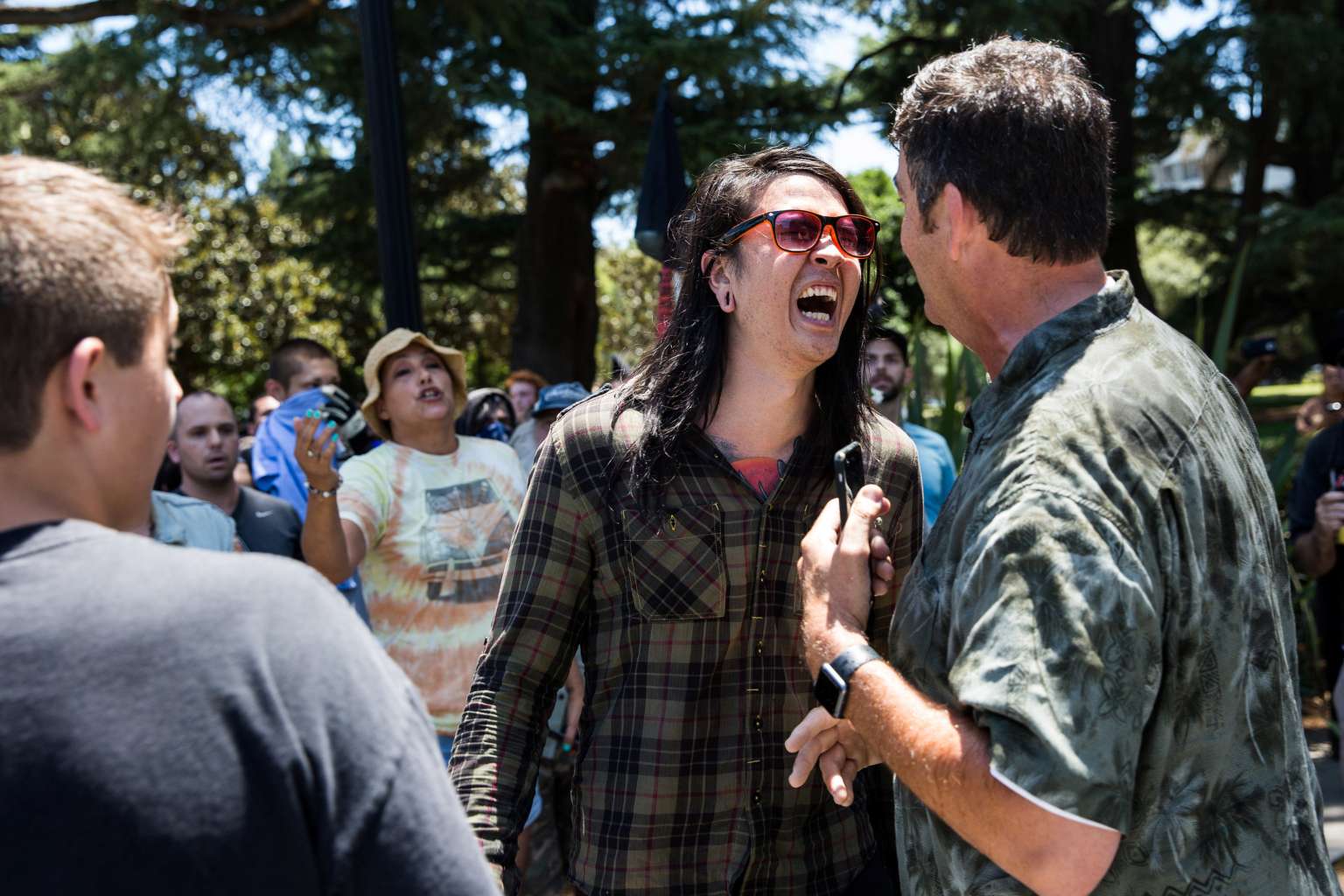 A protestor confronts a man during a clash between neo-Nazis holding a permitted rally and counter-protestors in Sacramento, California, on June 26, 2016.