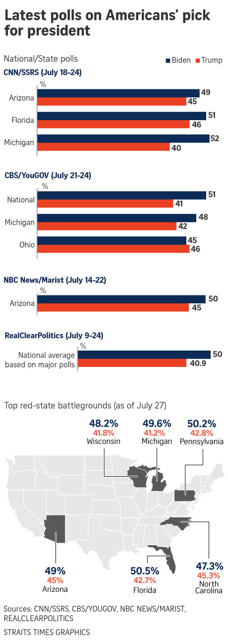 In the latest blow to his hopes to be returned to the White House on Nov 3, polls released on Sunday showed his support cratering in three critical battleground states.